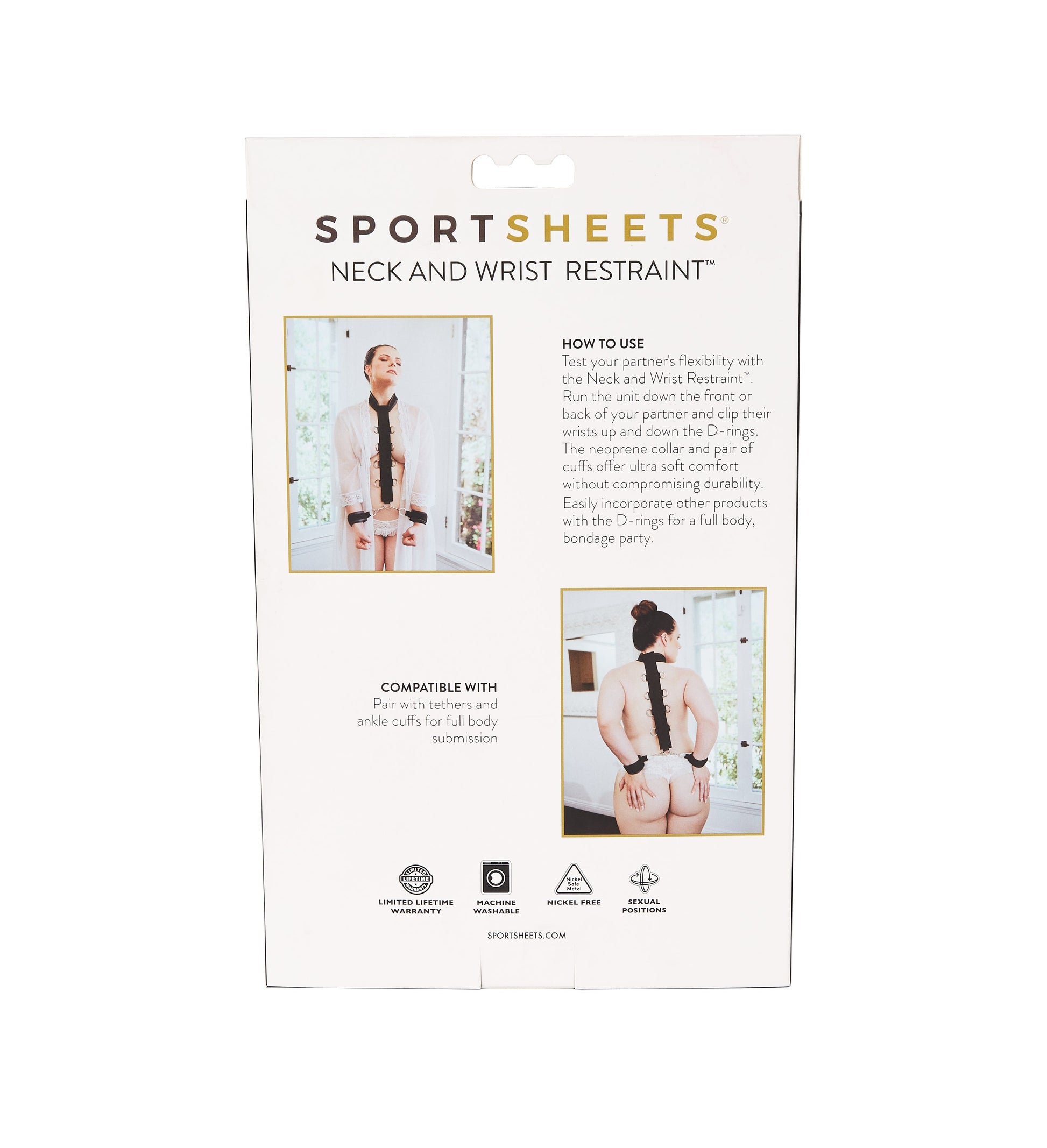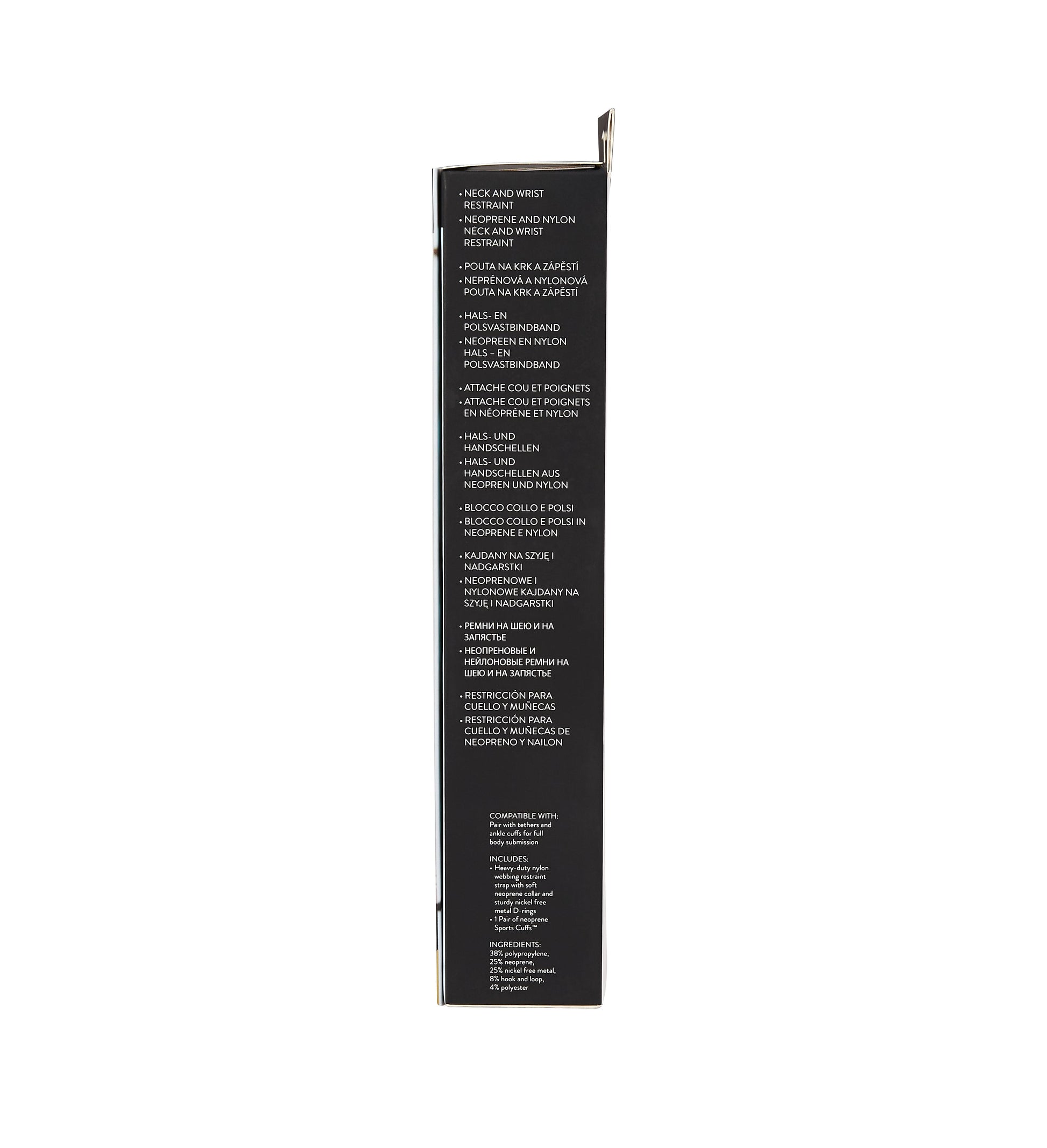 - Includes: Heavy duty nylon webbing restraint strap with soft neoprene collar and sturdy nickel free metal D-rings, 1 pair of neoprene Sports Cuffs