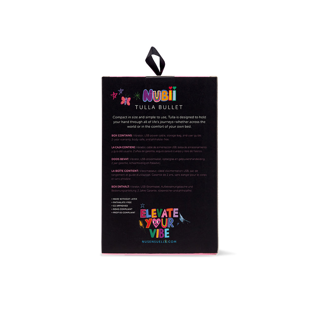 Joining the Nubii collection is Tulla–our rounded bullet with 10 vibrations. Compact and ergonomically designed, Tulla makes for the perfect travel companion. This beginner-friendly bullet will hold your hand through all life’s journeys–whether across the world or in the comfort of your bed. Powered by the Nubii motor, this rechargeable bullet vibrator offers unparalleled power and the opportunity to grow alongside the Nu Sensuelle brand.