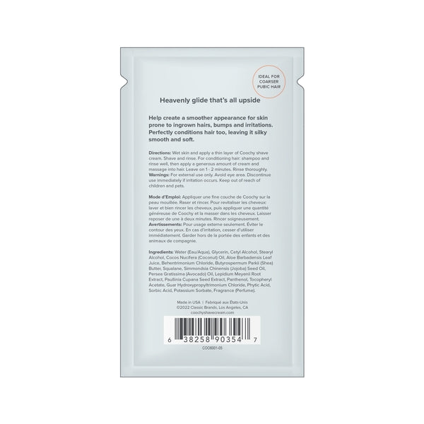 Wet skin and apply a thin layer of Coochy. Shave and rinse. For conditioning hair: shampoo and rinse well, then apply a generous amount of Coochy and massage into hair. Leave on 1-2 minutes. Rinse thoroughly.